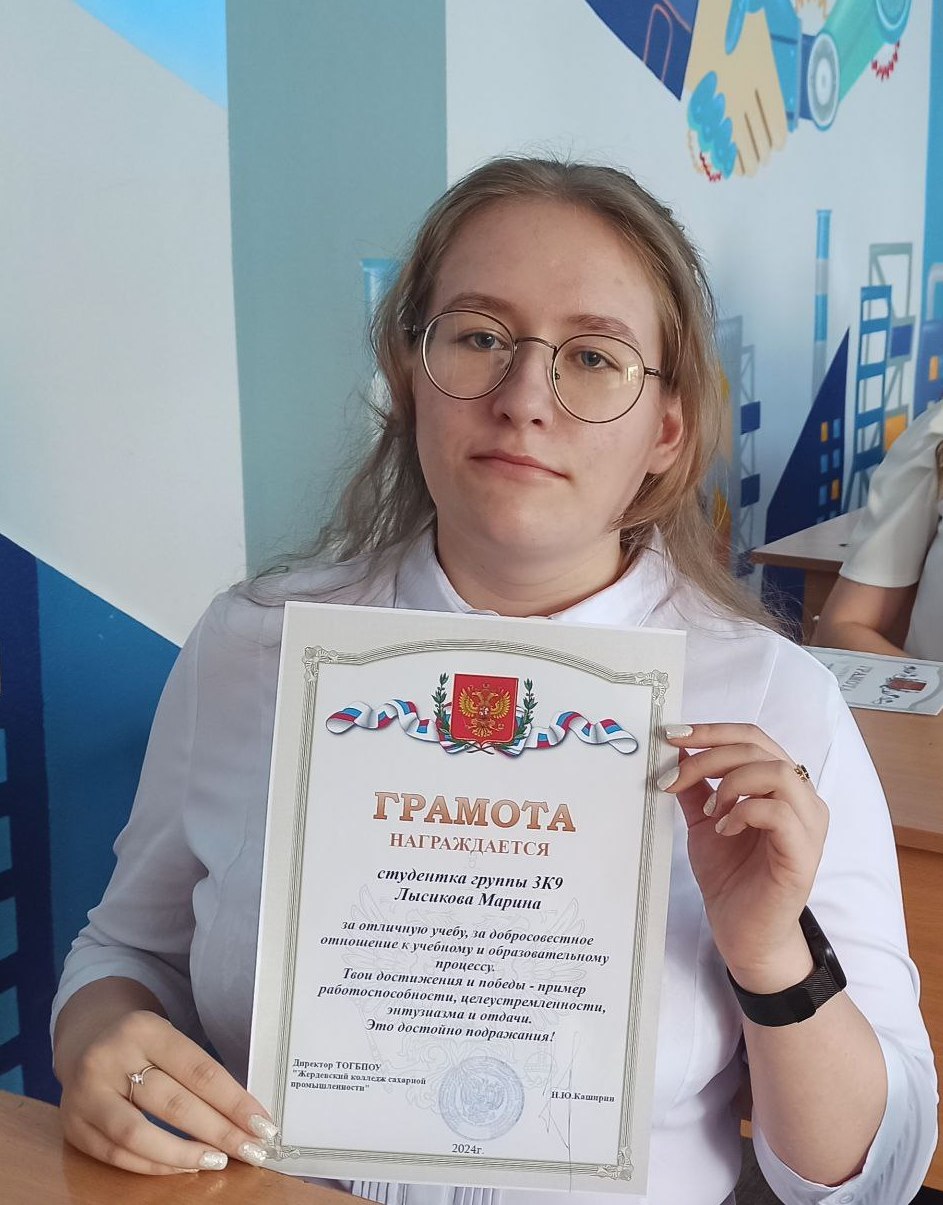 Успешно освоила специальность "Коммерция (по отраслям)". За время обучения показала себя как дисциплинированная, ответственная и целеустремленная студентка.За период обучения Лысикова Марина продемонстрировала отличные знания по профессиональным дисциплинам.Проявляла творческий подход к решению задач, предлагала собственные идеи в ходе учебных проектов. Активно участвовала в жизни учебного заведения.